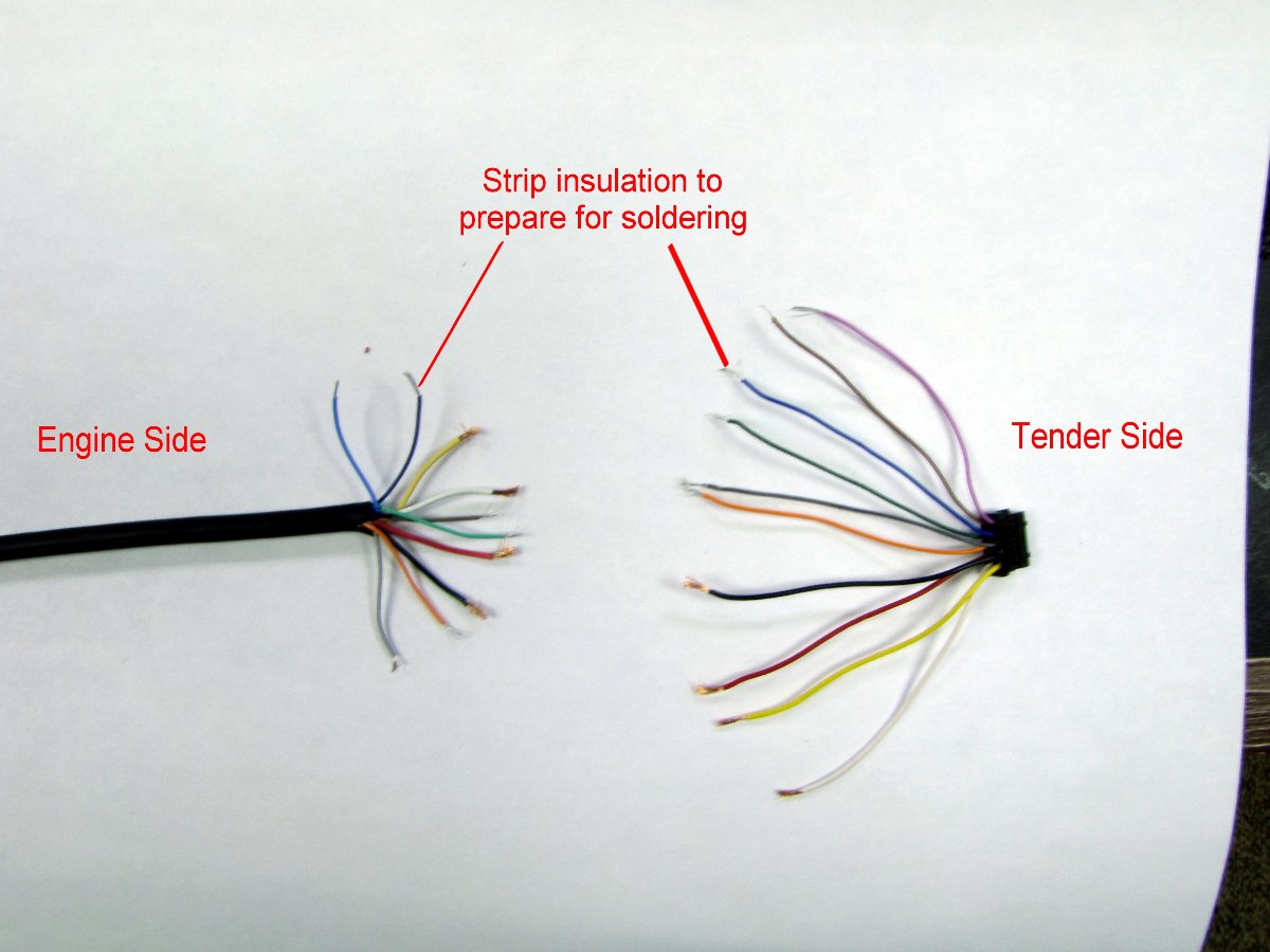 The goal is to determine how the pins are connected from the engine connector to the connector inside the tender via the existing "curly" tether. Don't assume that the pin numbers match one for one. In other words, don't assume pin1 on the engine connector goes to pin 1 on the connector inside the tether. Once we know how the pins connect, we can wire the new "straight" connector to make the same pin connections.